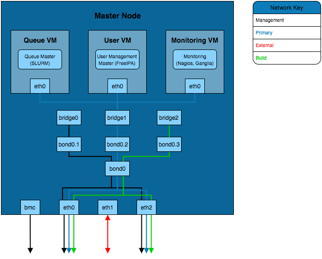 This solution separates the services into VMs running on the master node. In order for these VMs to be able to connect to the primary network a network bridge is created that allows the VM interfaces to send traffic over the eth0 interface.