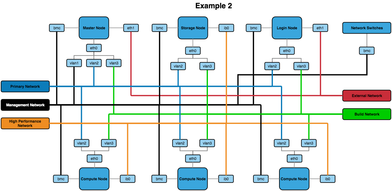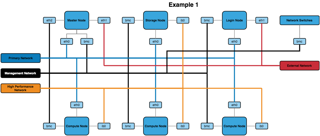 - External Networks - The network outside of the HPC environment that nodes may need to access. For example, the Master Node could be connected to an Active Directory server on the external network and behave as a slave to relay user information to the rest of the HPC environment.