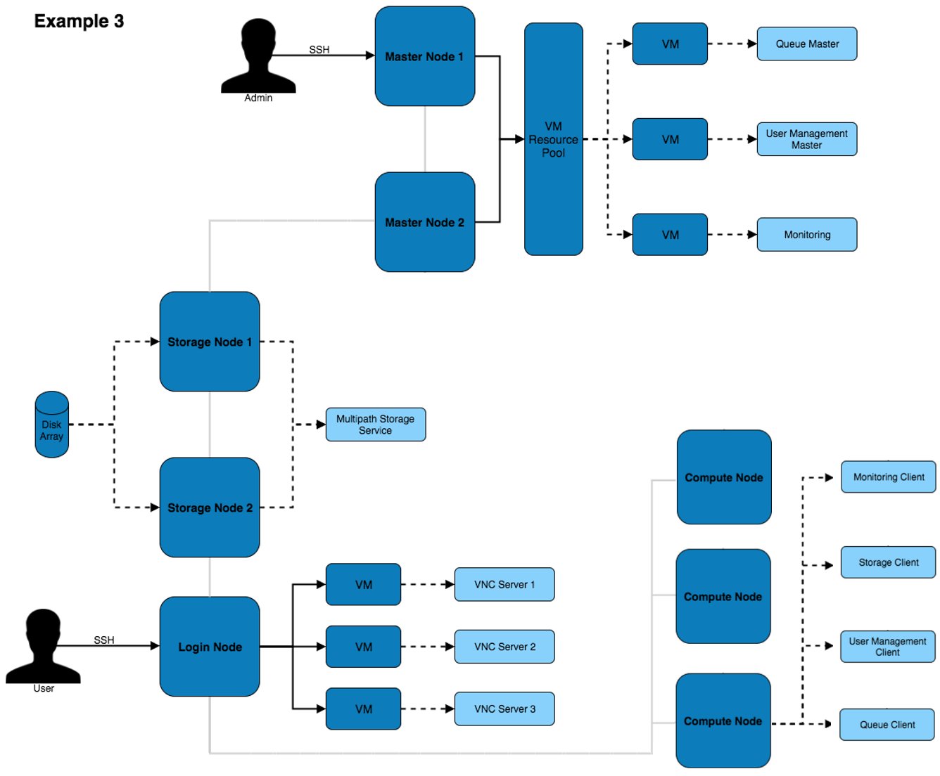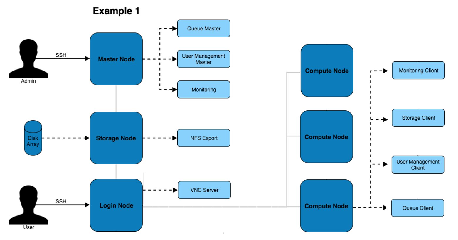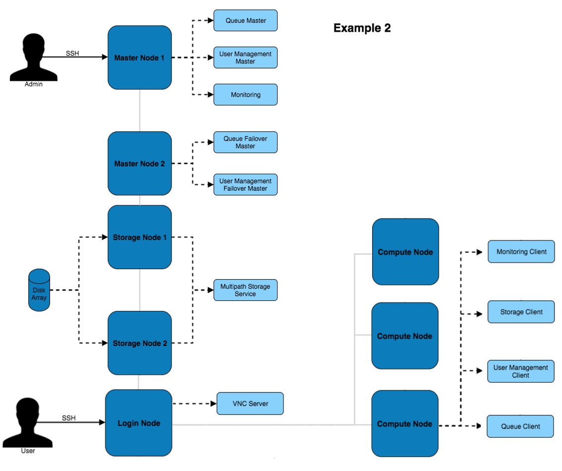 The above architecture consists of master, login and compute nodes. The services provided by the master & login nodes can be seen to the right of each node type. This architecture only separates the services for users and admins.
