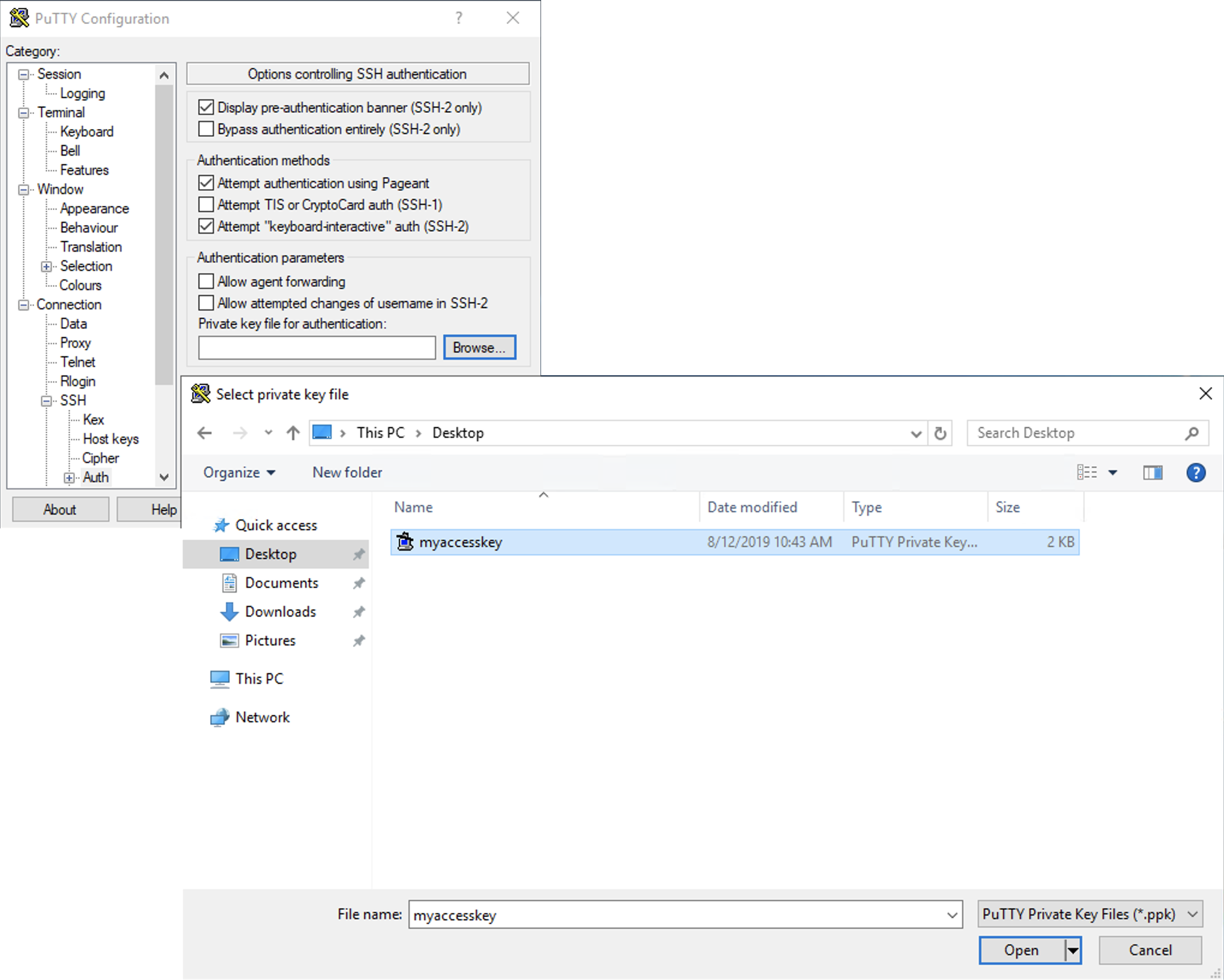 To load the key in Putty, select Connection -> SSH -> Auth, click Browse and select the ppk that was generated from the above steps.