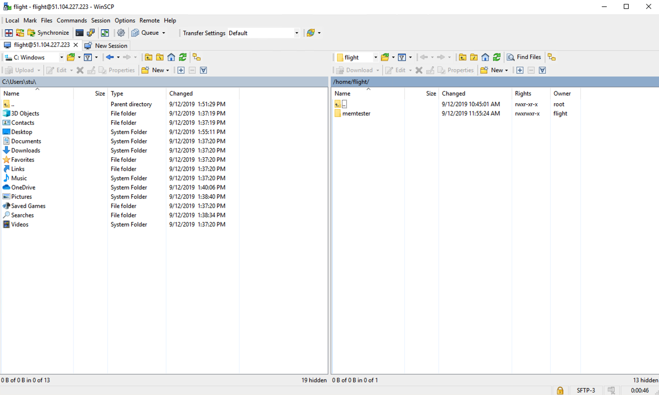 - WinSCP will login to your research environment; the window shows your local client machine on the left, and the research environment on the right